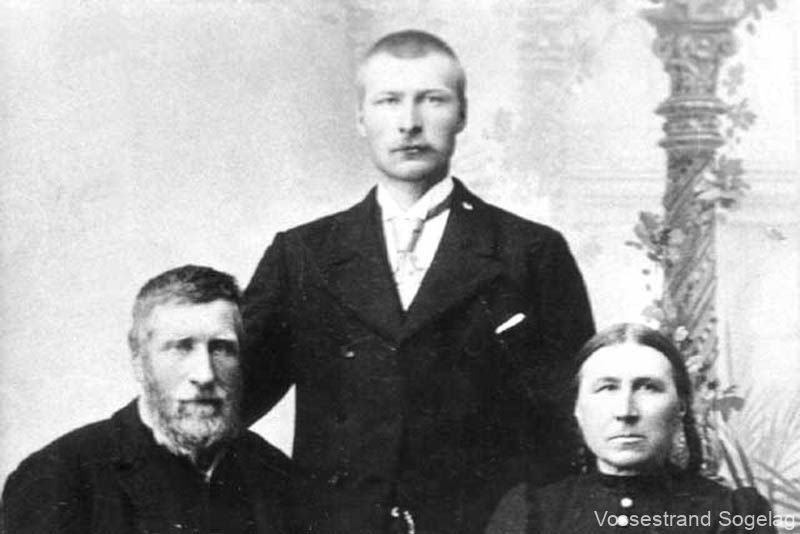 Frå venstre. Anders Halsteinson Øvre Oppheim f. 1842 - Øvre Oppheim 58c, sonen Hallstein Slen f.1873 - Slen 50c, og kona Kari Mikkjelsdtr Rygg f.1847 Rygg 50d og Slen 50