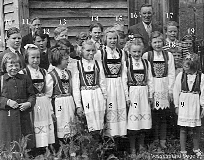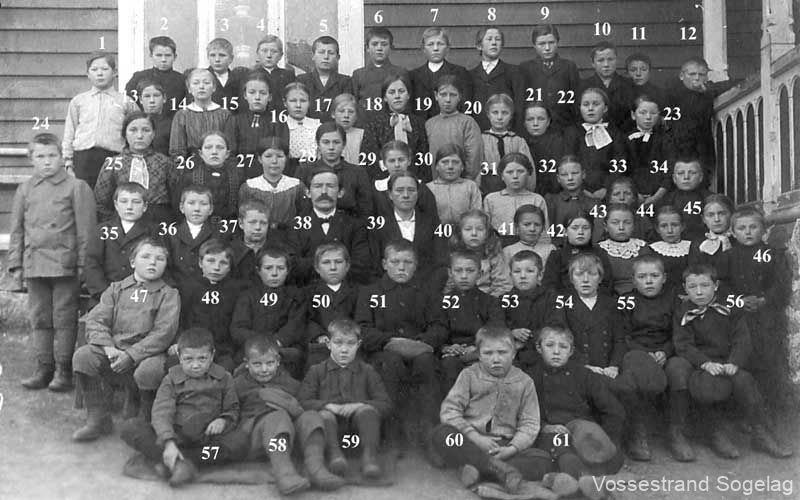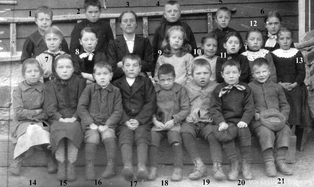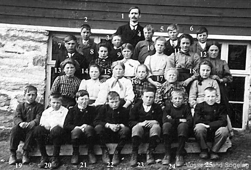 23.Guro Tveite, 24.Olav A. Flisram, 25.Katrina Flisram, 26.Anna K. Skjervheim, 27.Marta K. Hirth, 28.Marta A. Nesheim, 29.Lilly Håvardstun, 30.Maria Myrland, 31.Anna Myrland, 32.Inger S. Hirth, 33.Brita O. Mørkve, 34.Nils Jordalen, 35.Kjell Skjervheim, 36.Ingvald O. Skjervheim, 37.Olav H. Skjervheim, 38.Lars Spilde (Lærar), 39.Marta Sausjord (Lærarinne), 40.Johanna Skjervheim, 41.Borghild A. Bystøl, 42.Lisa Ulvund, 43.Margreta A. Nesheim,(g.m. Olav Humlebrekke), 44.Kristina Nesheim,(g.m. Ingebrikt Refsdal), 45.Gudveig Ulvund,(g.m. Sjur Hommedal), 46.Sjur Ulvund (førskule), 47.Sjur Flisram (Sjur-Ola Flisramshuse), 48.Anton Bystøl, 49.Artur A. Nesheim, 50.Olav A. Skjervheim, 51.Styrkår Hirth, 52.Olav A. Nesheim, 53.Lars A. Flisram, 54.Ingvald H. Skjervheim, 55.Olav L. Ulvund,