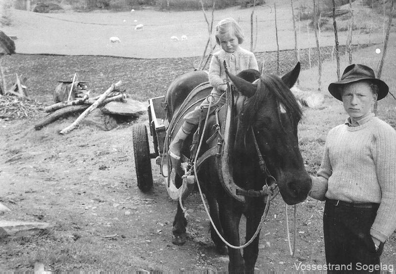 På hesten Ingebjørg K. Tveite f. 1949 og Ingvald K. Tveite f. 1934 Biletet er teke på Tveite i
