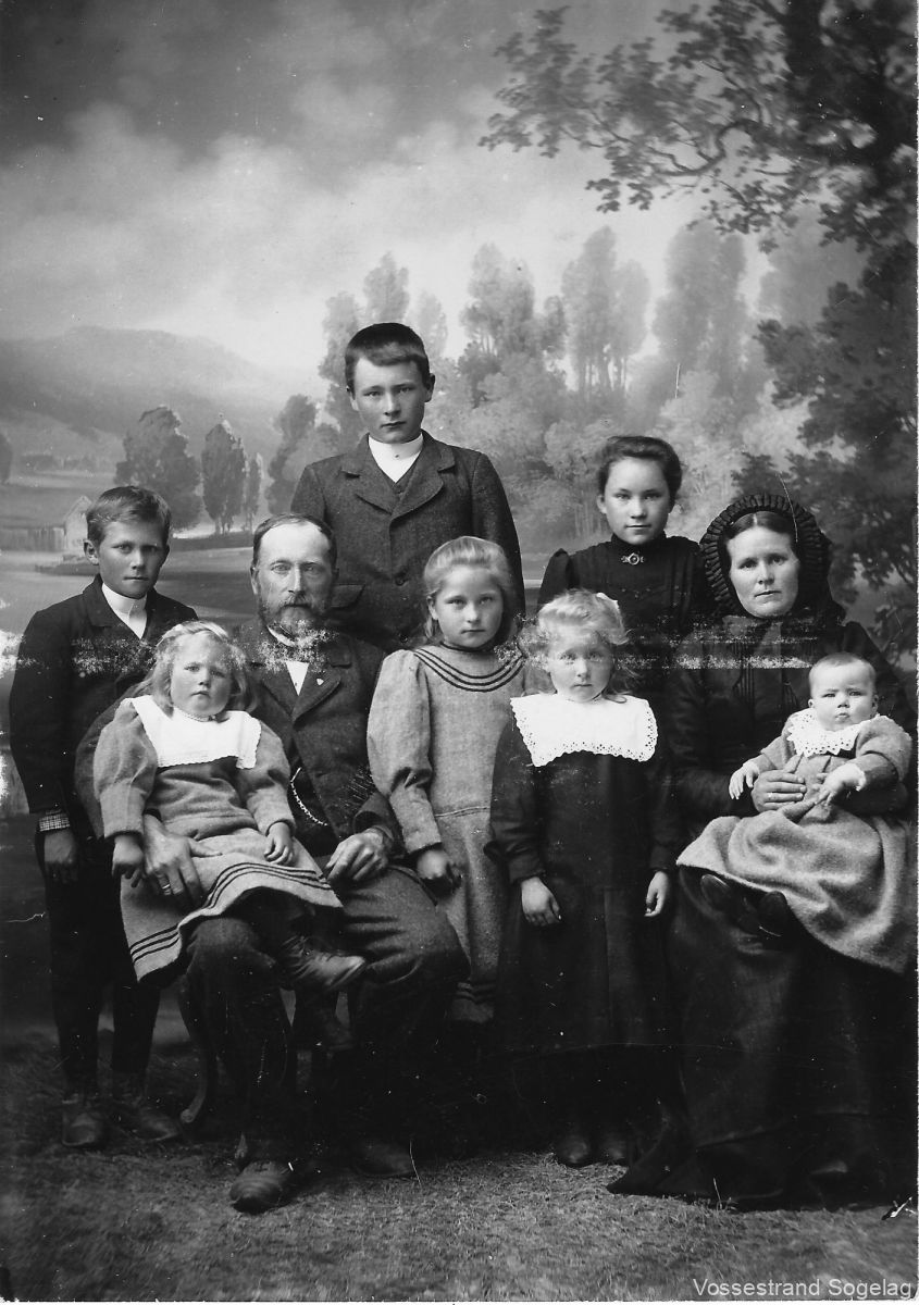Olav Daveson Sausjord 1869-1966 og Ingebjørg Andersdtr. Kyte 1867-1949med borna året 1908. Frå venstre: Anders 1898-1976 (Mosjøen), bak: David 1893-1979 (Sausjord), Gjøri 1895-1990 (Sausjord), på fanget til far: Anna 1905-1996 (g.Loven), Brita 1900-1981 (g.Løen), Ingebjørg 1902-1918 og på fanget til mor: Borghild 1907-2001 (g.Refsdal)Eigar av bilete: Bjørg SausjordSamla inn av: Anne Herheim -